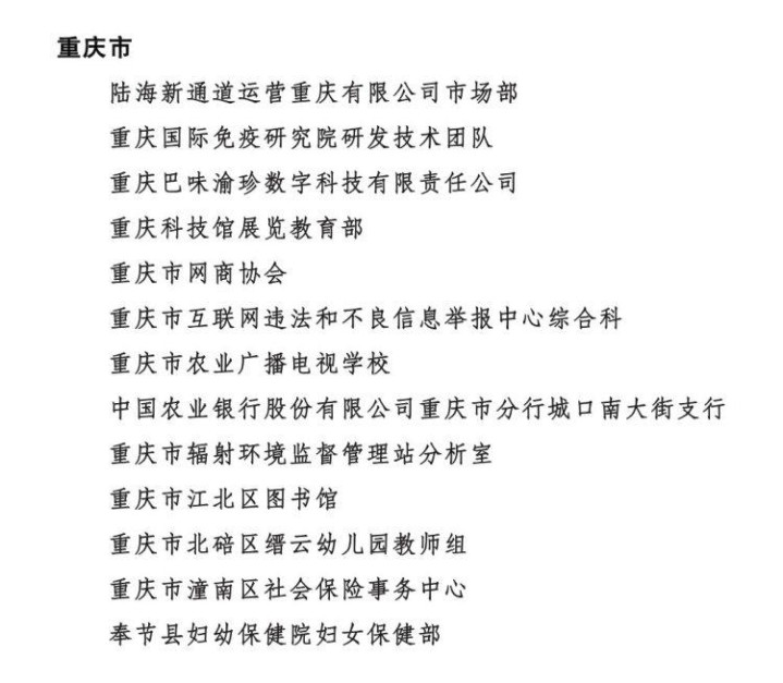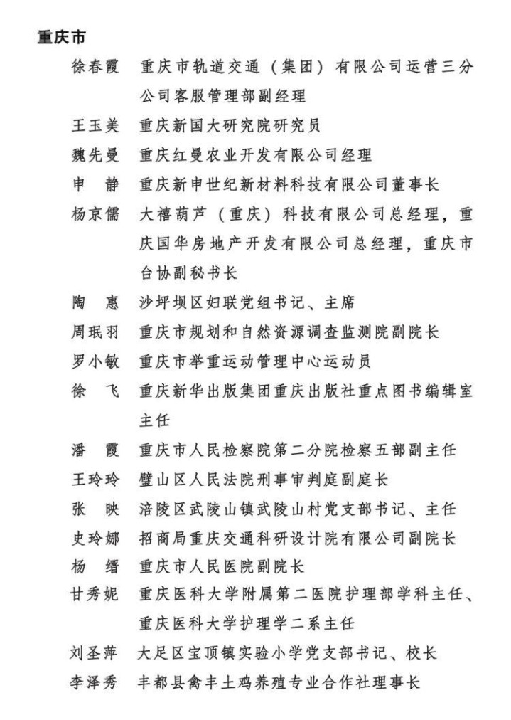 名单中,重庆市有17人被授予全国三八红旗手称号,12个单位被授予全国三八红旗集体称号,13个单位被授予全国巾帼文明岗称号。